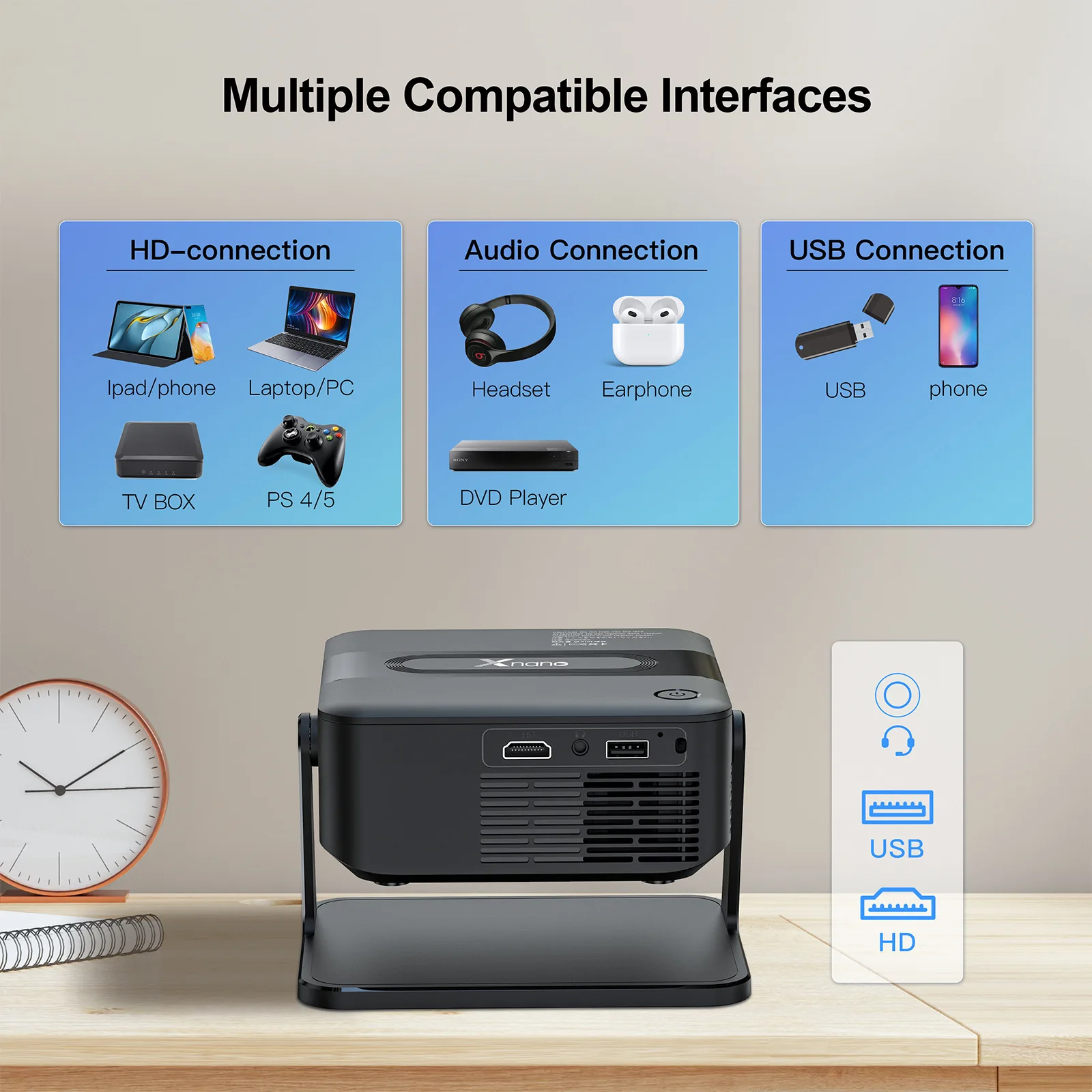 Adjustable Stand: Offers versatile viewing angles for optimal projection.
